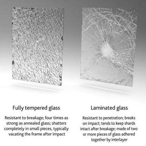 • Fully Tempered Glass: Also known as toughened glass is four times stronger than standard glass, shattering into small, blunt pieces. It is difficult to break, requires effort and is noisy when broken. It deters unwanted guests and is a safer glass for occupants and users of the building.